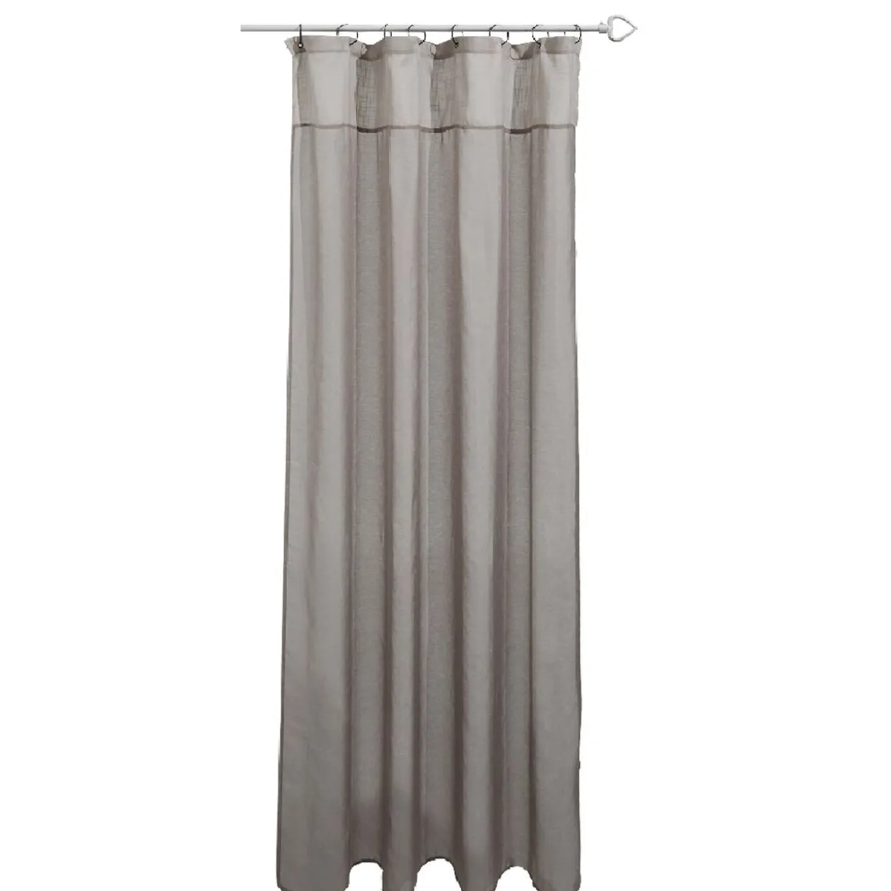 Voilage à oeillets uni taupe avec suspension anneaux noirs.